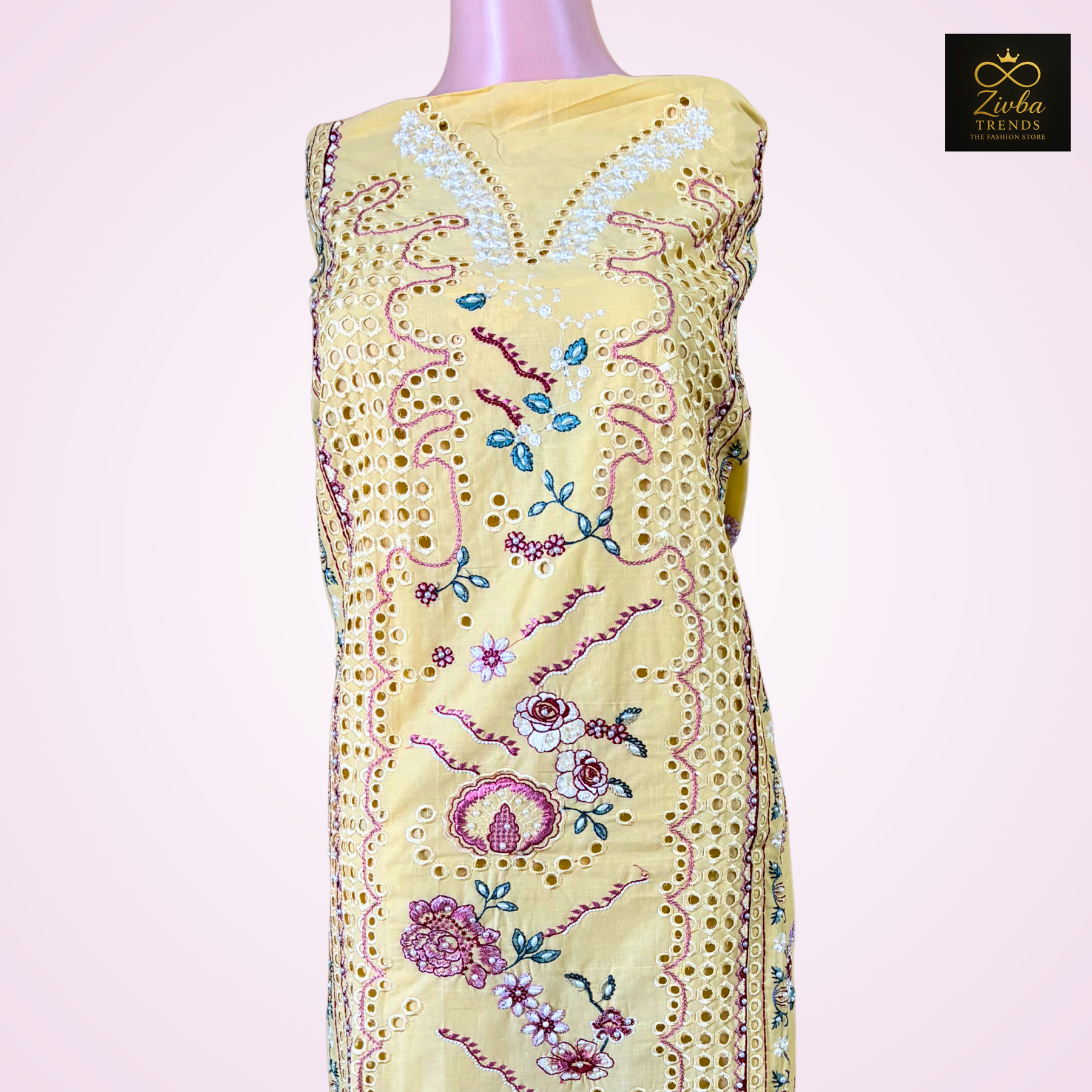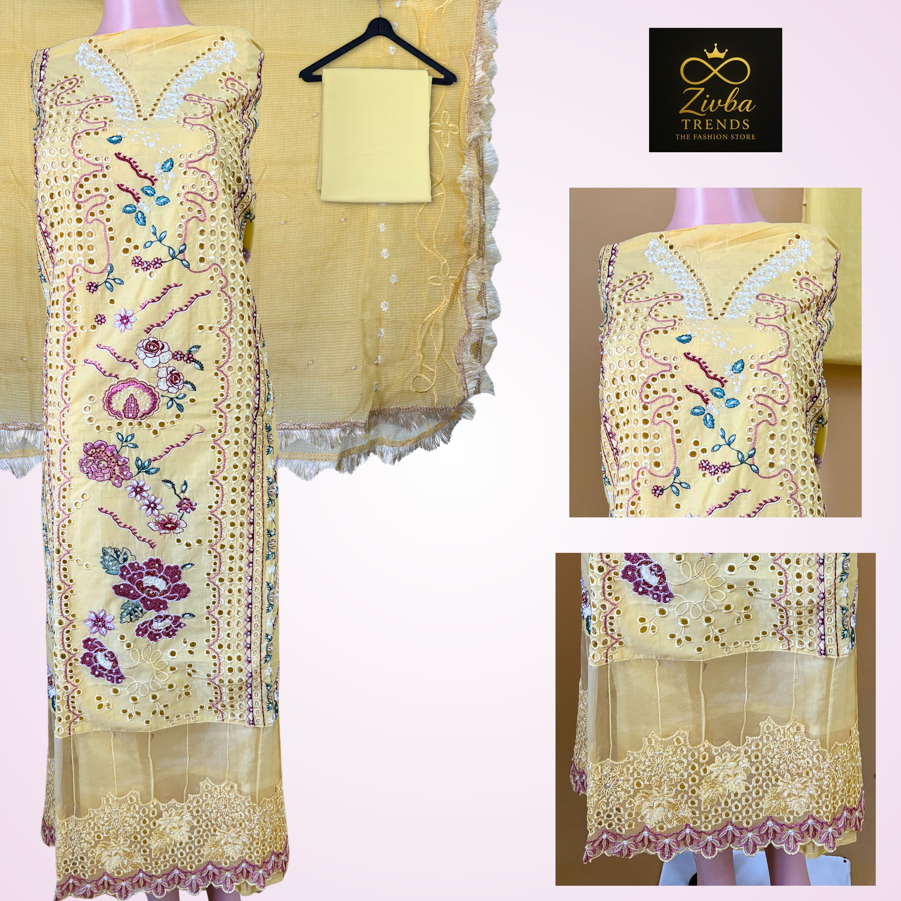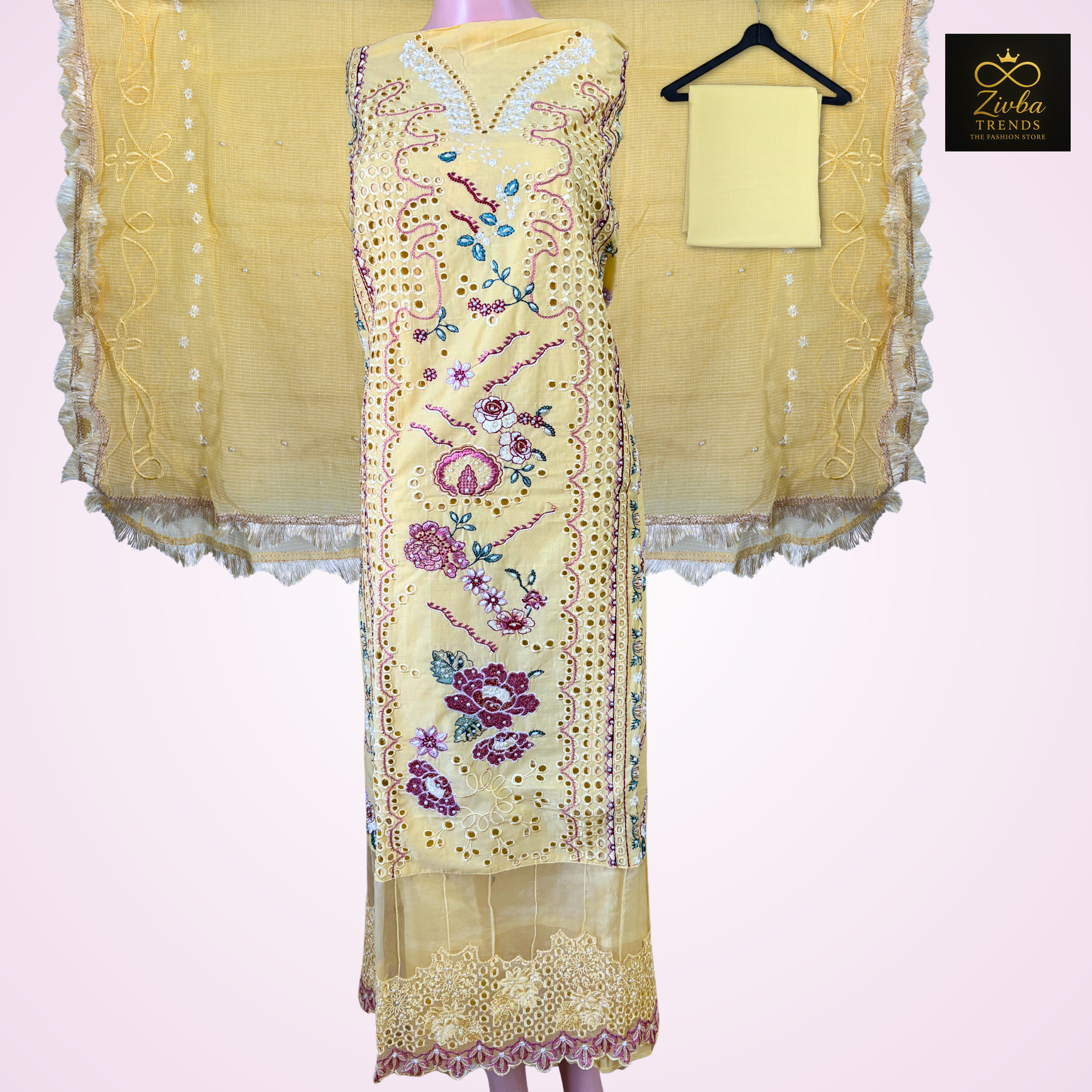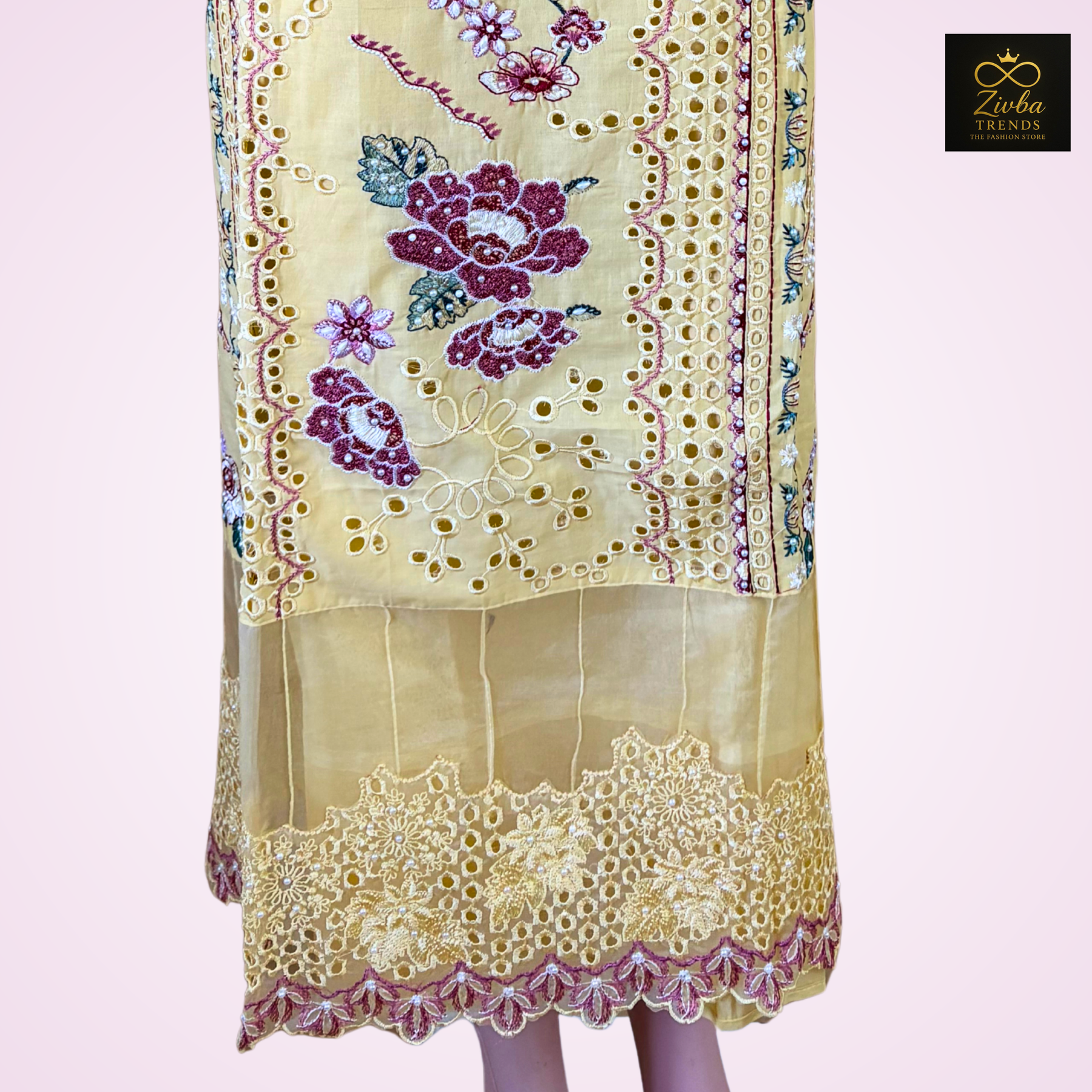 | Unstitched Suit – Yellow Cut Work Design Color: Bright Yellow Type: Unstitched Fabric: Premium Pakistani Fabric Work: Elegant Cut Work + Embroidery Kurta: Unstitched yellow fabric with delicate cut-work embroidery. Approx kurta length: 46–48 inches (standard 2.5 meter fabric). Bottom: Plain yellow bottom fabric, soft and smooth. Approx length: 2.25–2.5 meters. Dupatta: Beautiful matching dupatta with neat cut-work detailing. Approx length: 84–88 inches, width: 32–36 inches. Highlights: Vibrant yellow shade perfect for festive & daytime functions Rich Pakistani cut-work detailing for an elegant look Customizable stitching for all body sizes Breathable, comfortable & premium-quality fabric |