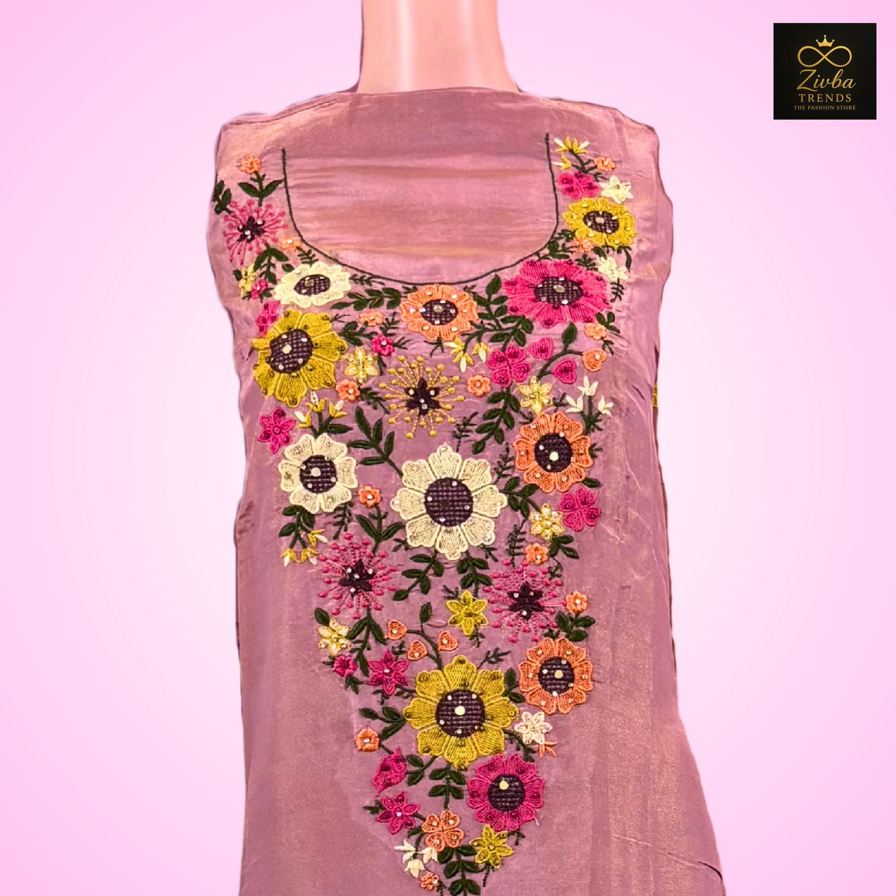 | Light Onion Pink Shine Tussle Suit Set Fabric: Shine Tussle & Sentun Type: Semi-Stitched / Unstitched 3-Piece Set Includes: Kurta, Bottom & Dupatta ________________________________________ Kurta Details: • Elegant light onion pink shine tussle fabric • Beautiful embroidery with delicate mirror work on front panel • Length: 44 inches (approx.) • Subtle shine finish adds a festive charm ________________________________________ Bottom Details: • Plain sentun fabric in matching onion pink shade • Length: 2.25 meters (approx.) • Soft, smooth, and perfect for all-day comfort ________________________________________ Dupatta Details: • Length: 48 inches | Width: 23 inches (approx.) • Crafted from fine fabric with floral embroidery work • Elegant and lightweight, ideal for festive or ethnic wear ________________________________________ Highlights: • Premium shine tussle fabric for a rich look • Intricate embroidery and mirror detailing • Ideal for festive, party, or traditional occasions ________________________________________ Care Instructions: • Dry clean only • Store in a cool, dry place |