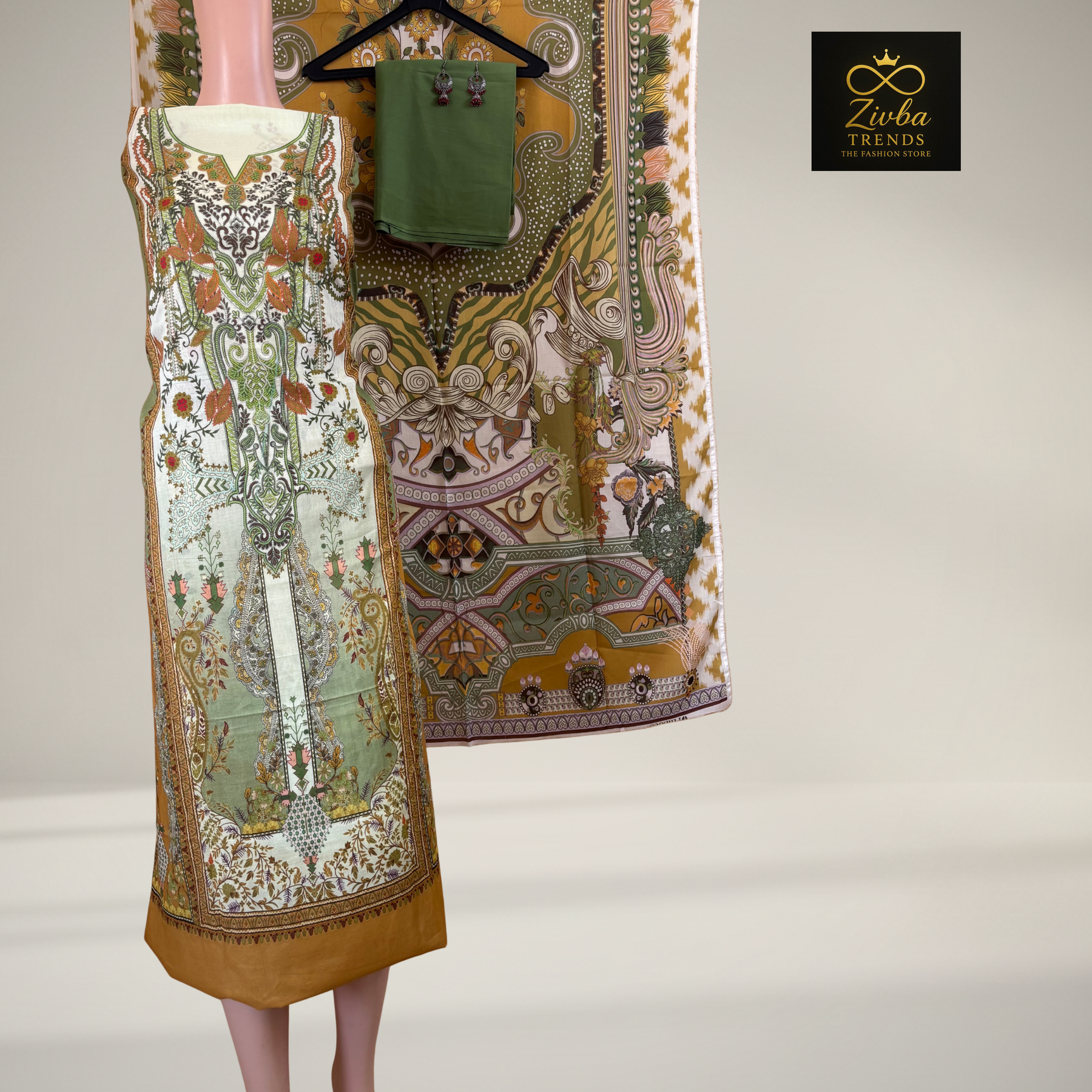 | Parrot green Printed Suit Set with Elegant Floral Detailing Fabric: Cotton lion Color: parrot green & Multi-Color Accents Type: Unstitched / Dress Material Set Includes: Kurta, Bottom, and Dupatta ________________________________________ Kurta Details: • Exquisite parrot kurta featuring rich floral and paisley printed design • Vibrant contrast patterns on the neckline and borders add a touch of sophistication • Length: 2.5 meters (unstitched) • Made from soft and breathable cotton blend fabric, perfect for daily wear ________________________________________ Bottom Fabric: • Plain same colour bottom fabric • Length: 2.5 meters • Suitable for pant, churidar, or salwar-style stitching ________________________________________ Dupatta: • Multi-colored printed dupatta with elegant ethnic motifs and border detailing • Length: 2.5 meters (approx.) • Lightweight, soft, and perfectly complements the kurta ________________________________________ Highlights: • Beautiful ethnic floral print with artistic contrast patterns • Comfortable cotton blend fabric ideal for all-day wear • Perfect for casual gatherings, festive wear, or office wear • Eye-catching light parrot green tone adds richness and elegance ________________________________________ Care Instructions: • Gentle hand wash in cold water • Avoid bleach and harsh detergents |