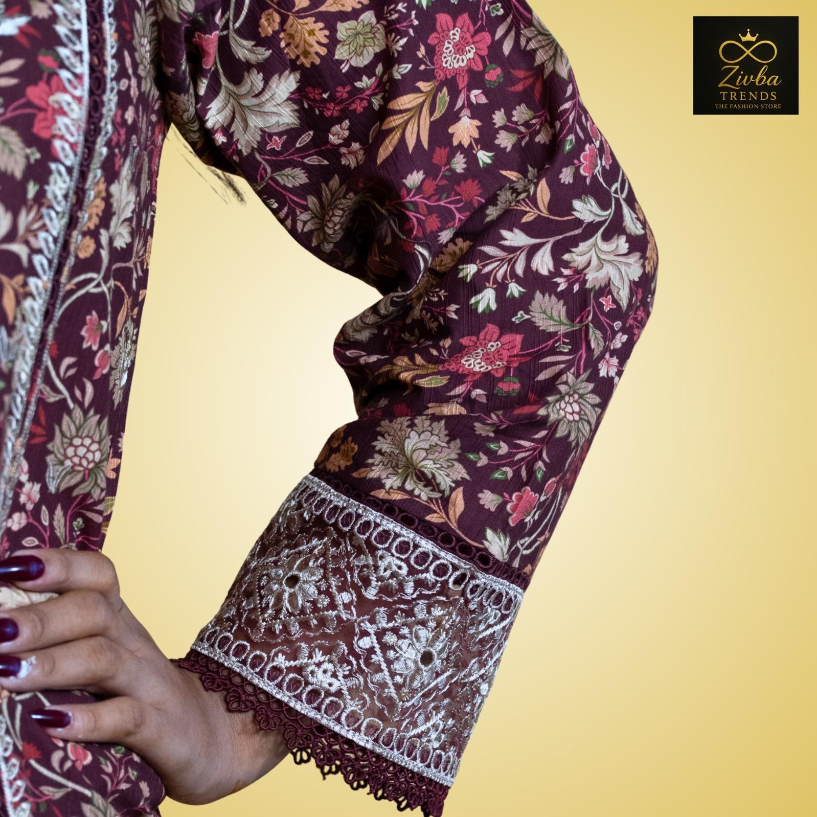 Maroon Embroidered Printed Kurta Set with Dupatta