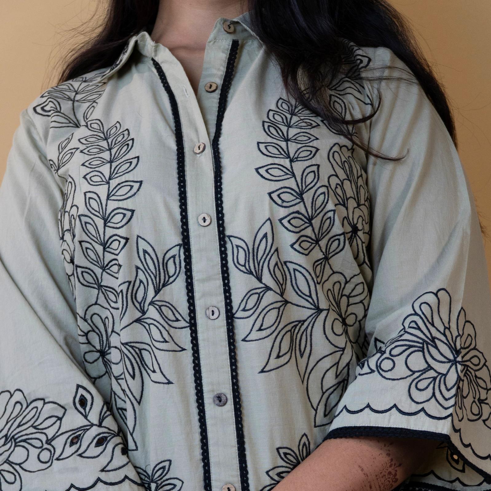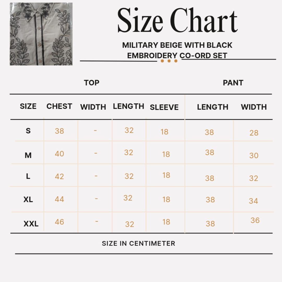 | Product Name: Military Beige Pure Cotton Co-ord Set with Black Embroidery Description: Stay effortlessly elegant with this Military Beige Co-ord Set, crafted from 100% pure cotton for ultimate comfort and breathability. The top features beautiful black embroidery that adds a striking contrast to the subtle beige tone, creating a perfect blend of grace and sophistication. Paired with matching cotton pants, this co-ord set is ideal for festive gatherings, casual outings, or workwear. Key Features: • Fabric: 100% Pure Cotton – soft, breathable, and skin-friendly • Color: Military Beige with Black Embroidery • Set Includes: Embroidered Top & Matching Pants • Top Details: o Length: 32 inches o Sleeve Length: 18 inches o Available Sizes: S (38), M (40), L (42), XL (44), XXL (46) • Pant Details: o Length: 38 inches o Waist Width: 28" to 36" (as per size) • Fit Type: Regular Comfortable Fit • Occasion: Casual Wear | Office Wear | Festive Events | Day Outings • Care Instructions: Gentle hand wash separately in cold water |