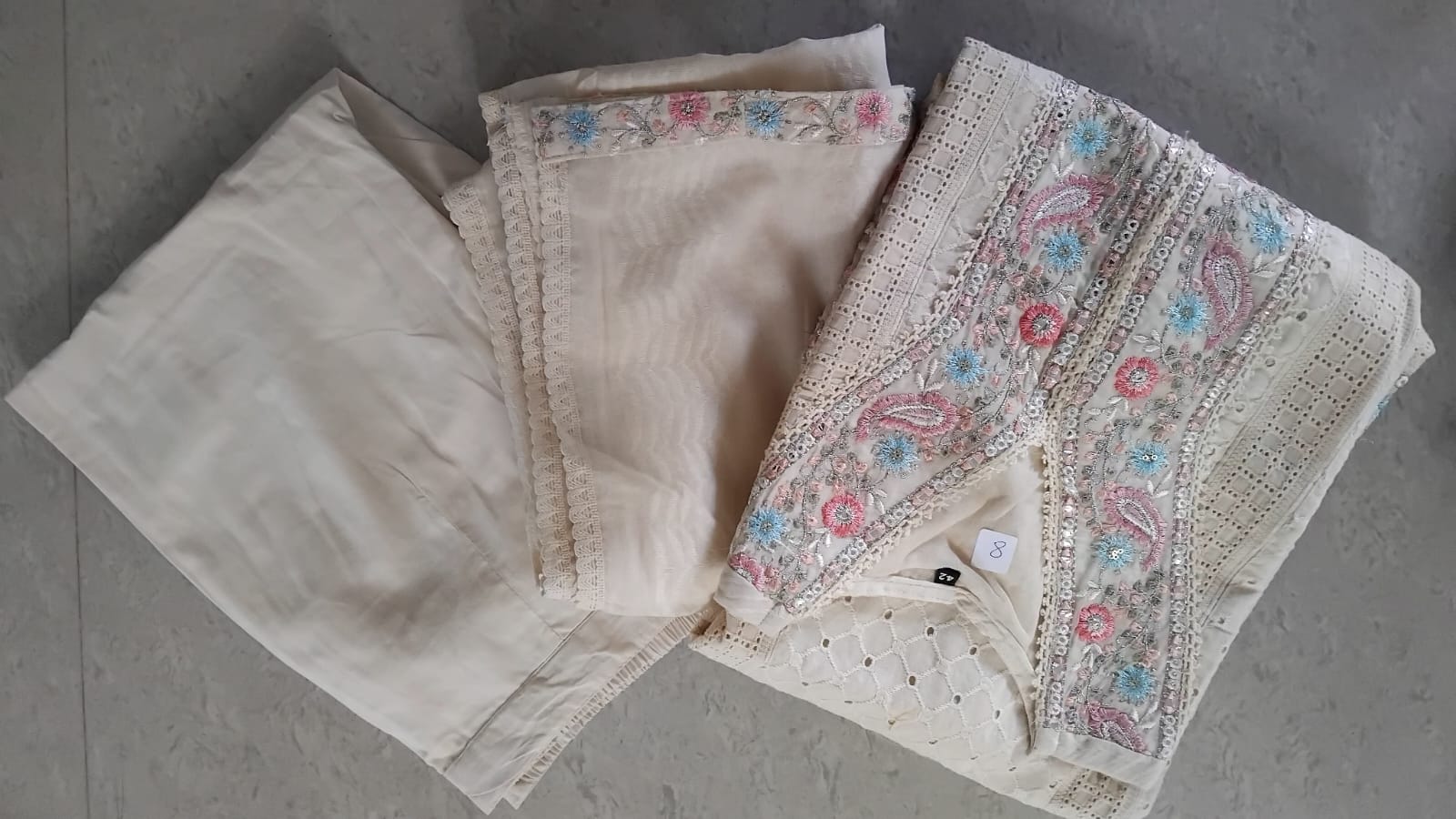 | Off White Cotton Chikankari Cutwork Readymade Set Fabric: 100% Cotton Color: Elegant Off White Type: 3-Piece Readymade Set Includes: Kurti, Pant & Dupatta ________________________________________ Kurti Details: • Classic off-white cotton kurti with exquisite Chikankari embroidery and delicate cutwork • Crafted for a graceful and breathable summer look • Length: 46 inches • Chest: 42 inches • Sleeves: 21 inches (full sleeves) • Soft cotton fabric for day-long comfort and style ________________________________________ Bottom (Pant): • Plain cotton pant in matching off-white shade • Comfortable and easy to wear • Length: 38 inches • Waist: 32 inches (elasticated) ________________________________________ Dupatta: • Elegant cotton dupatta with 2-side lace detailing and embroidered border work • Adds a refined and graceful touch • Length: 82 inches | Width: 33 inches ________________________________________ Highlights: • Intricate Chikankari cutwork embroidery on pure cotton • Lightweight, breathable & perfect for all-day wear • Ideal for casual outings, festive gatherings, or office wear • Elegant off-white tone suits all skin tones ________________________________________ Care Instructions: • Gentle hand wash recommended • Use mild detergent • Iron on low heat |