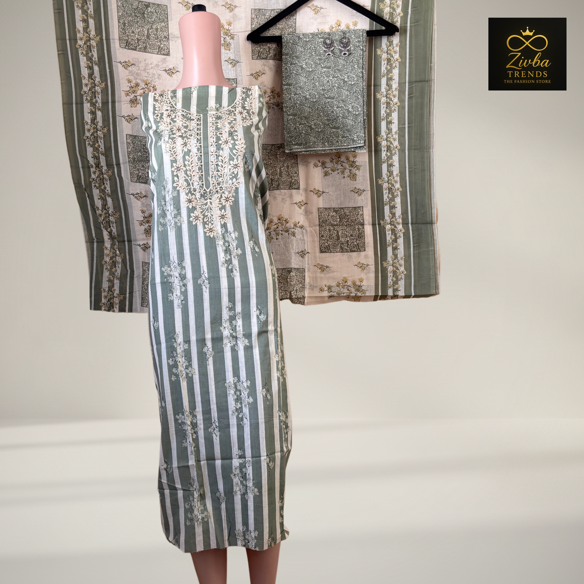 | Pista Green Printed Suit Set with Thread Embroidery Fabric: Cotton Color: Pista Green Type: Unstitched / Dress Material Set Includes: Kurta, Bottom, and Dupatta Kurta: • Soft pista green and white printed fabric with delicate floral thread embroidery on the front • Length: 44 inches (unstitched) • Elegant pastel tone perfect for summer and festive occasions Bottom: • Matching pista green printed bottom • Length: 94 inches Dupatta: • Coordinated pista green printed dupatta with floral and stripe design • Length: 88 inches | Width: 40 inches Highlights: • Elegant embroidery on soothing pastel fabric • Comfortable cotton blend for daily and festive wear |